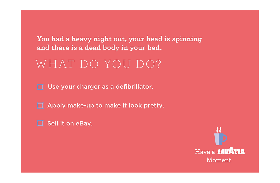 (similar to how hoover or Google became verbs). The campaign could run forever – Murphy’s Law ensures never-ending material – while the copy execution can hijack any news within minutes. But where does that leave the CSR? The self-promoter’s paradox explains that consumers are sceptical of overly positive CSR advertising claims (Pomering and Johnson, 2009). Therefore, we needed to find a covert way to advertise Lavazza’s sustainability efforts. The advertising will draw the consumer towards the brand’s website where they will be able to create their own Lavazza moments, therefore engaging with the campaign and the brand. They will also be guided towards other pages where they can find all the information regarding CSR.
